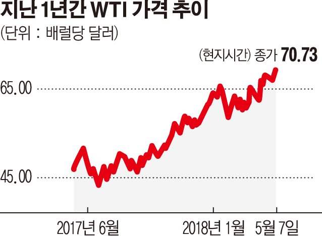 국제 원유시장에 긴장감이 맴돌고 있다. 도널드 트럼프 미국 대통령의 이란 핵합의 파기 우려가 커져 7일(현지시간) 서부 텍사스산 원유(WTI)가 70달러(약 7만5400원) 선을 돌파했다.