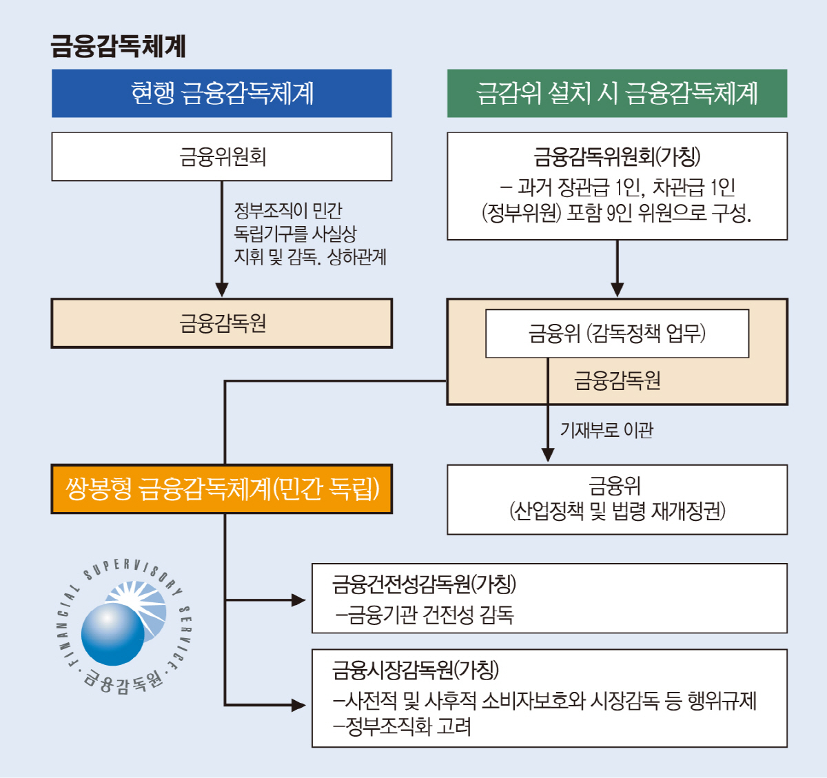 이는 현행 금융위-금감원 체계에서 금융위가 예산권으로 독립기구인 금감원을 사실상 지휘하는 형태를 보이는 데 대한 문제의식에서 출발한다. 쌍봉형 외에는 금융감독기구 출범 초기의 금융감독위원회를 재설치하는 방안 등도 검토된다.