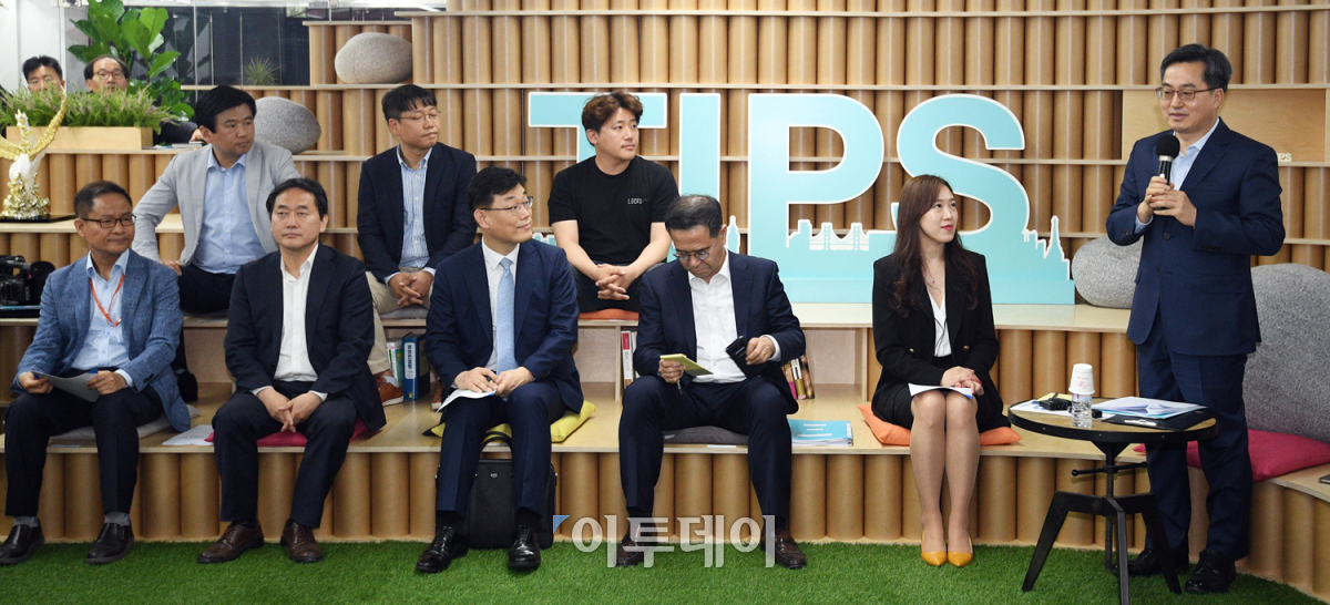 김동연 경제부총리 겸 기획재정부 장관이 8일 정부 출범 1주년을 맞아 스타트업을 비롯한 창업 지원 공간인 서울 강남구 TIPS타운을 현장 방문해 기업인들과 1년간의 정책 성과와 민간사례를 공유하고 있다. 김 부총리는 지난해 8월 이곳을 찾아 ‘혁신성장’ 계획 등을 약속한 바 있다. 오승현 기자 osh@