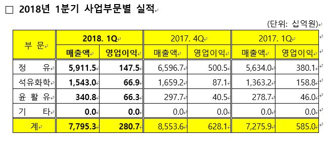 사업부문별 실적을 살펴보면 정유 매출액과 영업이익은 각각 5조9115억 원, 1475억 원, 석유화학 매출액과 영업이익은 각각 1조5430억 원, 669억 원, 윤활유의 매출액과 영업이익은 각각 3408억 원, 663억 원이다.