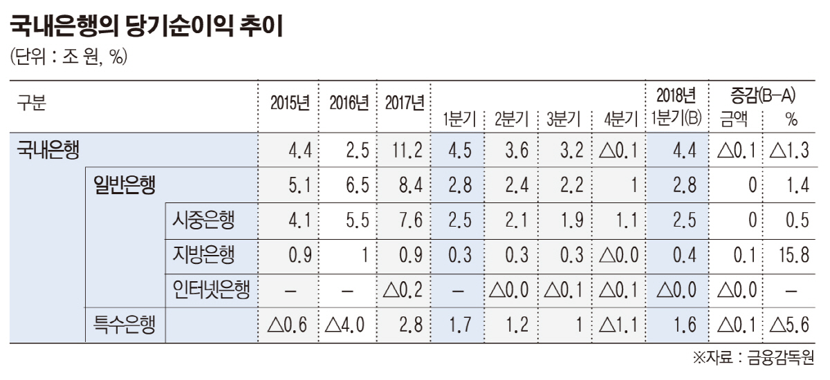 금융감독원은 올해 1분기 국내은행의 당기순이익은 4조4000억 원으로 지난해 같은 기간(4조5000억 원) 보다 1000억 원(1.3%)가량 줄었다고 10일 밝혔다. 시중은행의 당기순익은 전년 대비 0.5% 상승한 데 비해 지방은행은 15.8%의 성장세를 보였다. 반면 특수은행은 5.6% 하락했다.