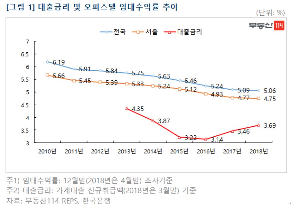 오피스텔에 대한 초과공급 우려감은 2019년에도 이어질 전망이어서 임대수익률은 추세적인 하락이 불가피할 것으로 보인다.