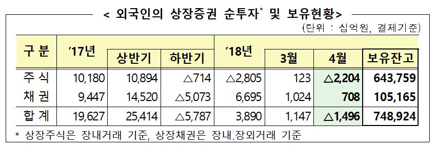 14일 금융감독원에 따르면 지난달 외국인은 국내 증시에서 상장주식 2조2204억 원어치를 순매도했다. 지난 3월 순매수(1230억 원)를 기록한 지 한 달만에 매도 우위로 전환했다.