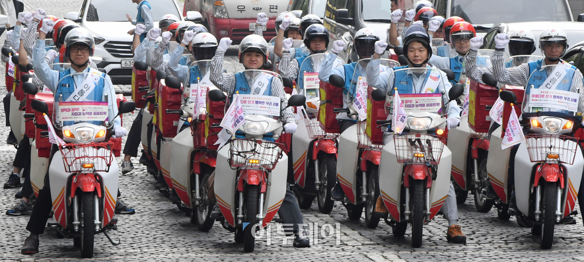 ‘제7회 전국동시지방선거’와 ‘국회의원 재·보궐선거’가 한 달여 앞으로 다가왔다. 선거를 30일 앞둔 14일 오전 서울 종로구 광화문우체국에서 서울특별시선거관리위원회와 서울지방우정청 집배원들이 동네 민주주의 실현을 위한 ‘집배원과 함께하는 아름다운 선거 홍보단 발대식’을 갖고 힘차게 출발하고 있다. 집배원들은 이날 발대식을 시작으로 아름다운 선거의 가치를 홍보할 오토바이 3천 대를 타고 서울시 곳곳을 누빈다. 오승현 기자 story@