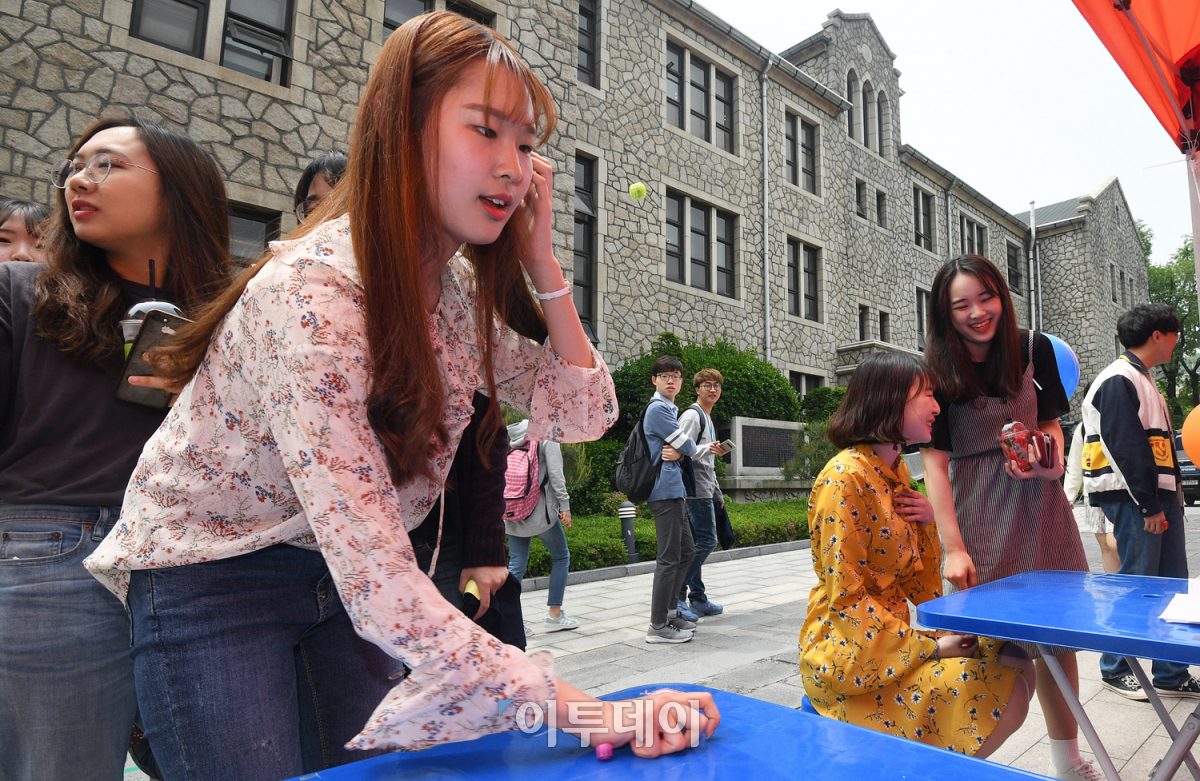 대학 생활의 낭만 ‘축제’가 열린 교정에 젊음의 열기가 폭발하고 있다. ‘2018 축제 루카루스 100℃’가 개막한 14일 서울 동작구 중앙대학교 서울캠퍼스에서 학생들이 추억의 공기놀이를 하며 축제의 묘미를 만끽하고 있다. 오승현 기자 osh@