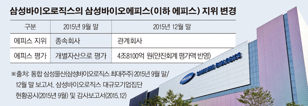 통합 삼성물산의 2015년 9월 말 분기보고서상에서 삼성바이오로직스는 삼성바이오에피스(이하 에피스)를 종속회사로 처리하고 있다. 그러나 3개월 후 12월 말 기준 사업보고서상에서는 에피스에 대한 지배력을 상실했다며 종속회사가 아닌 관계회사로 변경한다. 금감원에 보고된 재무제표를 근거로 하면 삼성바이오로직스가 에피스에 대한 지배력을 상실했다고 판단한 시점은 2015년 9월과 12월 사이인 것이다.