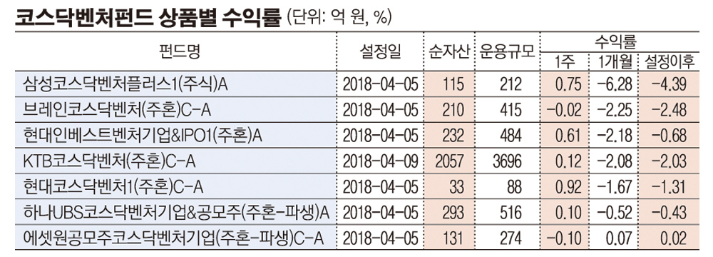 하지만 높아진 시장 기대감과 달리 현재까지 코스닥 벤처펀드의 수익률은 저조한 편이다. ‘삼성코스닥벤처플러스1(주식)A’는 14일까지 최근 1개월간 수익률 -6.28%를 기록해 가장 성과가 부진했다. 이외에도 ‘브레인코스닥벤처’(-2.25%), ‘현대인베스트벤처기업&IPO’(-2.18%), ‘KTB코스닥벤처’(-2.08%) 순으로 수익률이 낮았다. 플러스 수익률이 난 펀드는 ‘에셋원공모주코스닥벤처기업’ 펀드(0.07%)가 유일했다.