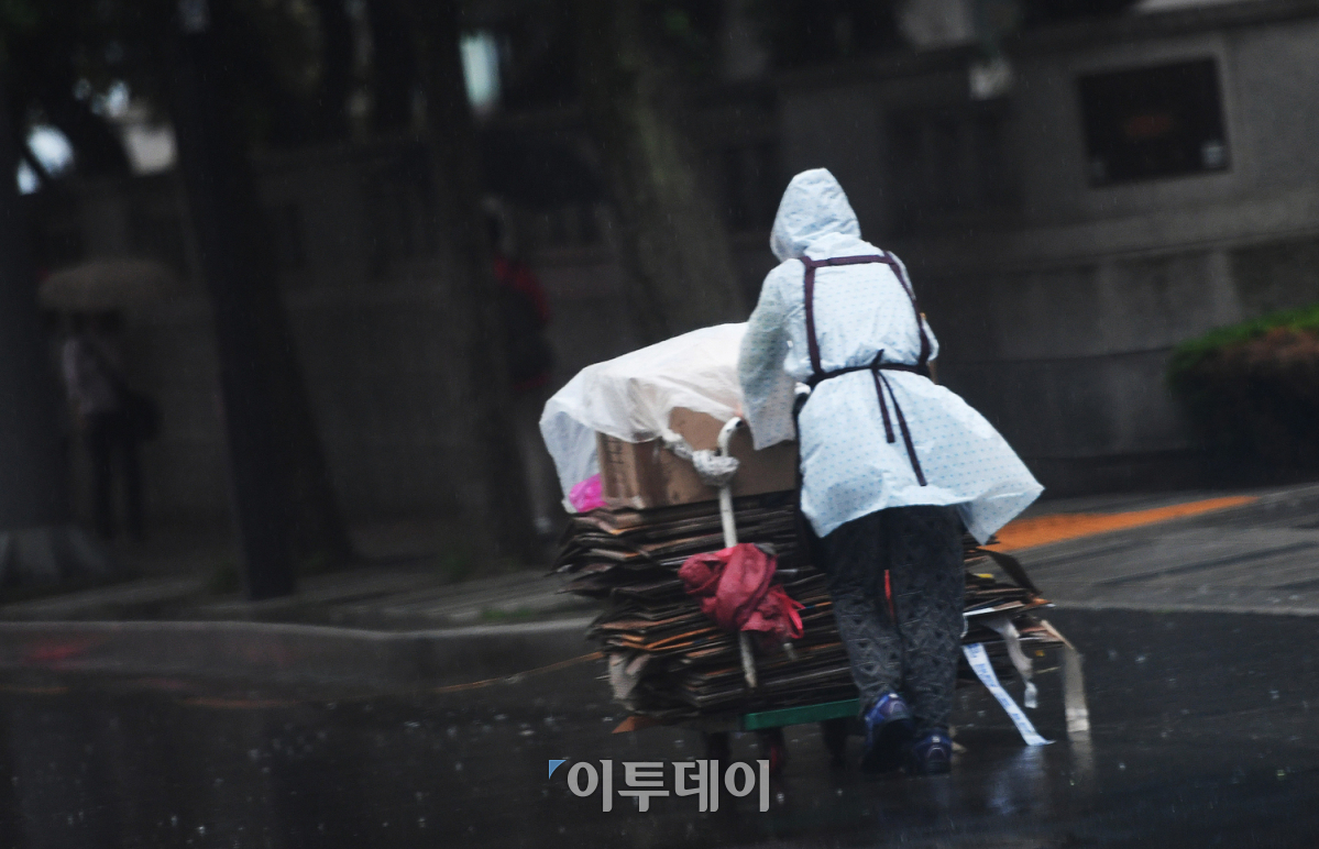 전국적으로 비가 내리기 시작한 16일 오전 서울 종로구 거리에서 한 노인이 수거한 폐지를 옮기고 있다. 기상청은 오는 18일까지 대기불안정에 의해 국지성 호우가 내리는 지역이 있을 것으로 보고, 시설물 관리 등을 당부했다. 오승현 기자 story@