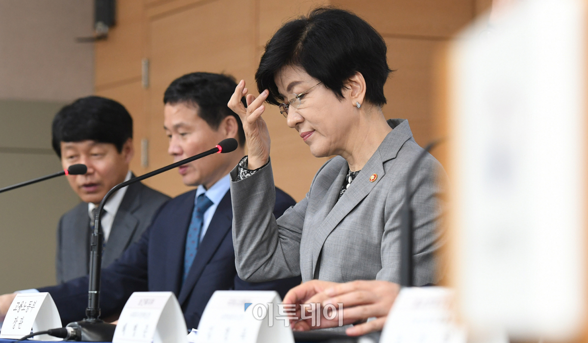김영주 고용노동부 장관을 비롯한 관계부처 실·국장들이 17일 오전 서울 종로구 정부서울청사 합동브리핑실에서 ‘노동시간 단축 현장안착 지원방안 정부 합동브리핑’을 하고 있다. 이날 정부는 브리핑에 앞서 이낙연 국무총리 주재로 열린 ‘국정현안점검 조정회의’에서 ‘노동시간 단축 현장안착 지원 방안’을 의결했다. 오승현 기자 story@