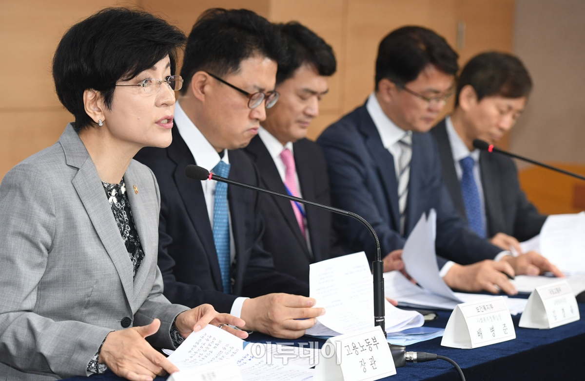 김영주 고용노동부 장관을 비롯한 관계부처 실·국장들이 17일 오전 서울 종로구 정부서울청사 합동브리핑실에서 ‘노동시간 단축 현장안착 지원방안 정부 합동브리핑’을 하고 있다. 이날 정부는 브리핑에 앞서 이낙연 국무총리 주재로 열린 ‘국정현안점검 조정회의’에서 ‘노동시간 단축 현장안착 지원 방안’을 의결했다. 오승현 기자 story@