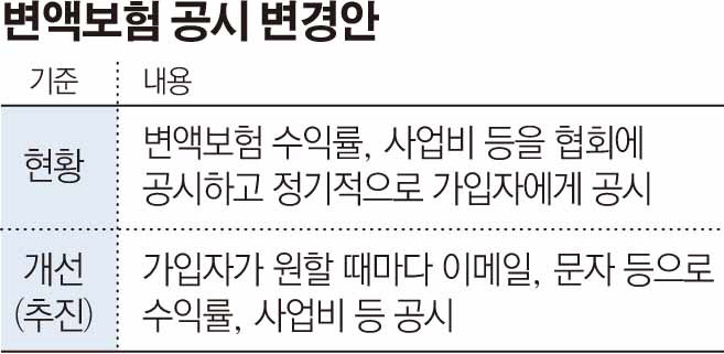 업계와의 의견 조율은 이미 마친 상태다. 금융위 관계자는 “업계와 비용 부담 등 의견을 들었는데 큰 문제는 없는 것으로 확인했다”며 “도입에는 문제가 없을 것”이라고 말했다. 변액보험은 목돈이나 노후생활자금 마련 등 ‘재테크’를 목적으로 활용된다. 때문에 사고나 위험 발생에 대비하기 위해 가입하는 보장성보험과 다르다. 특히 보험료 중 일부를 보험사가 주식이나 채권 등으로 운용, 가입자에게 수익을 나누는 형식이다. 그만큼 수익률, 사업비 등 수익성에 영향을 줘 정보에 가입자들이 민감할 수 밖에 없는 구조다.