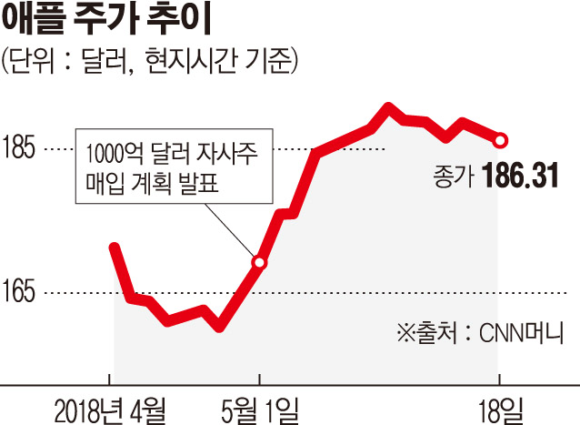 하워드 실버블라트 S&P다우존스지수 수석 애널리스트에 따르면 애플은 단일 기업 중 역대 최대인 228억 달러 규모의 자사주를 매입했다. 또 애플은 지난 1일 앞으로 1000억 달러 규모의 자사주 매입을 추가로 시행할 것이라 밝혔다. 기업은 주식 매수 수요를 만들면서 주당 순이익을 증가시킬 수 있는 자사주 매입을 선호하는 경향이 있다.