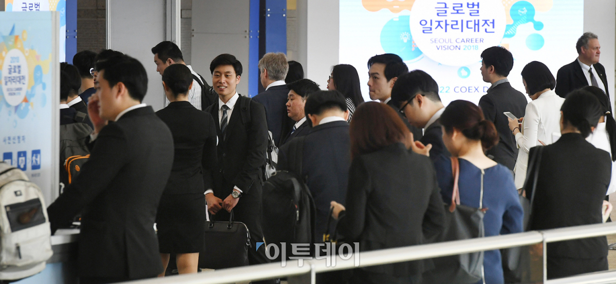 글로벌 기업과 해외 취업을 희망하지만, 시공간적 제약으로 해외에서 직접 구직활동이 어려운 이들을 위한 취업의 장이 열렸다. '2018 글로벌 일자리대전'이 개막한 21일 오전 서울 강남구 코엑스에서 구직자들이 줄지어 행사장 입장을 기다리고 있다. 해외 구인기업 190개사가 참가한 이 날 행사는 고용노동부가 주최하고 KOTRA와 한국산업인력공단이 주관했다. 오승현 기자 story@