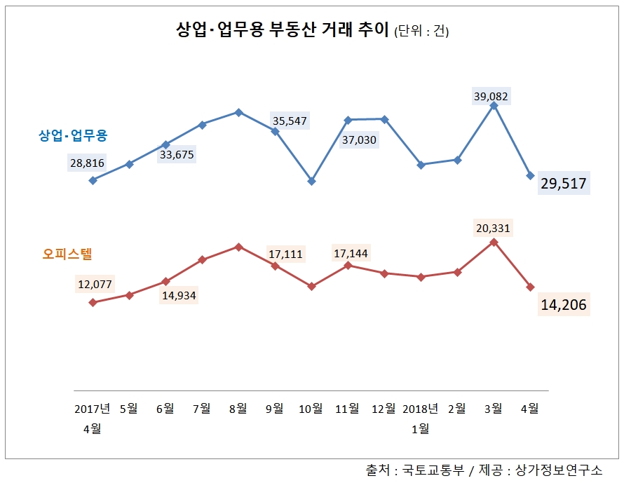 21일 상가정보연구소가 국토교통부 통계를 분석한 결과에 따르면 지난 4월 상업‧업무용부동산 거래건수는 2만9517건으로 전월의 3만9082건 대비 24.8% 감소했다. 전년 같은 기간의 2만8816건과 비교하면 2.4% 증가했다.