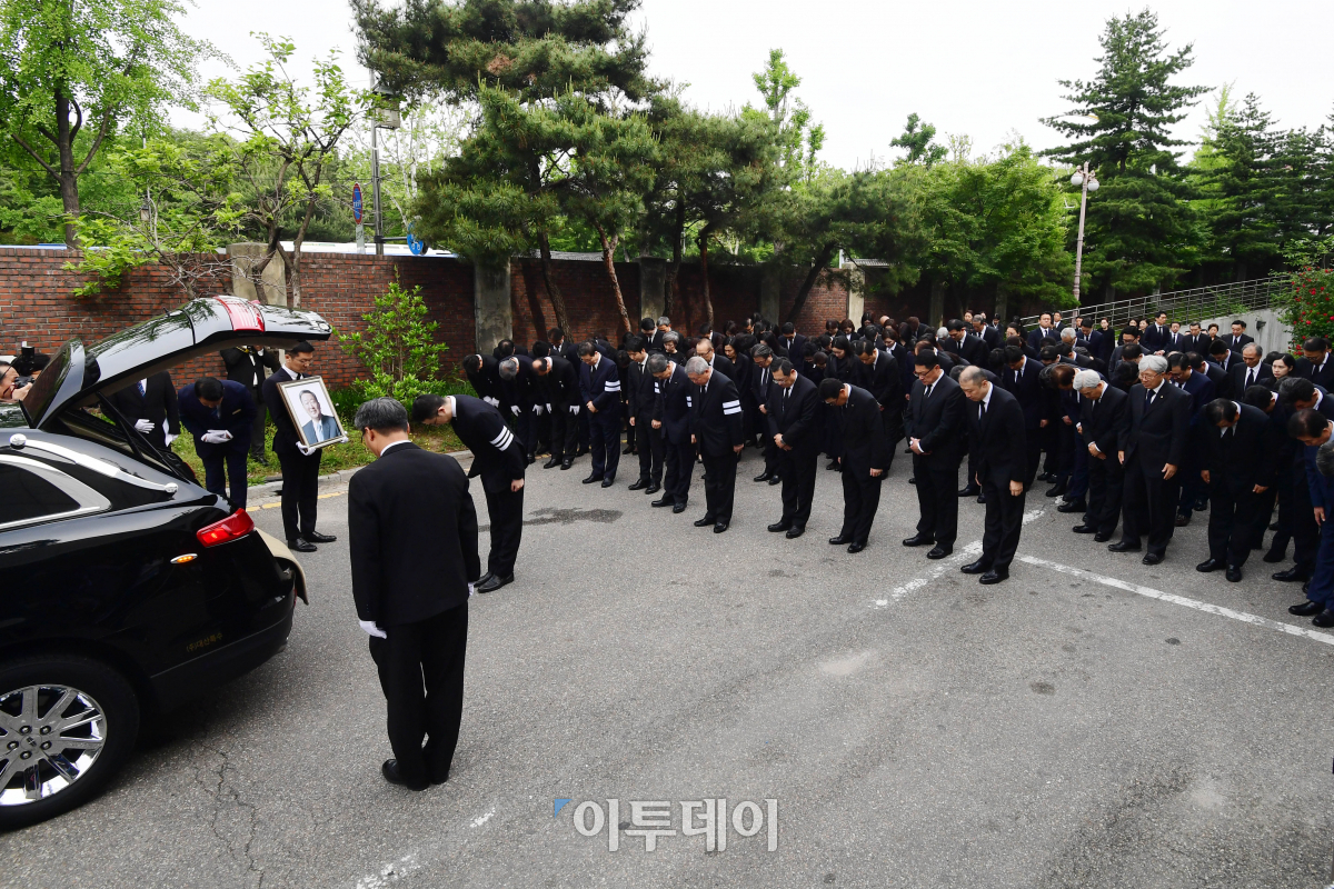 22일 오전 서울 종로구 연건동 서울대병원 장례식에서 열린 고(故) 구본무 LG 회장의 발인식에서 유가족과 관계자들이 고인의 운구차량을 향해 마지막 인사를 하고 있다. 고이란 기자 photoeran@