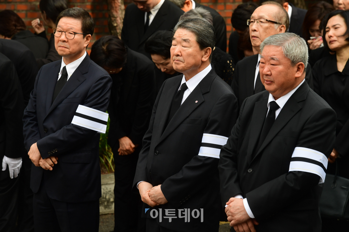 22일 오전 서울 종로구 연건동 서울대병원 장례식장에서 열린 고(故) 구본무 LG 회장의 발인식에서 고인의 동생 구본준(앞줄 가운데) LG 부회장, 구본능(오른쪽) 희성그룹 회장, 구본식(왼쪽) 희성그룹 부회장이 고인의 마지막길을 배웅하고 있다. 고이란 기자 photoeran@