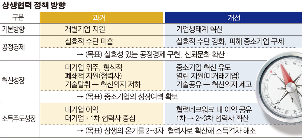 정부가 원사업자가 납품 단가를 깎기 위해 경영정보를 요구하는 경우 벌점을 매겨 공공 입찰 참여를 제한키로 한 것은 부당한 납품 단가 인하 관행을 근절하기 위한 조치다. 또 대기업의 상생지원이 ‘생색내기’에 그치고 있다는 지적에 대해선 기존 성과공유제를 ‘현금공유’ 중심으로 대폭 개편하고 ‘협력이익공유제’ 개념을 도입해 상생 협력의 실효성을 높인다는 복안이다.