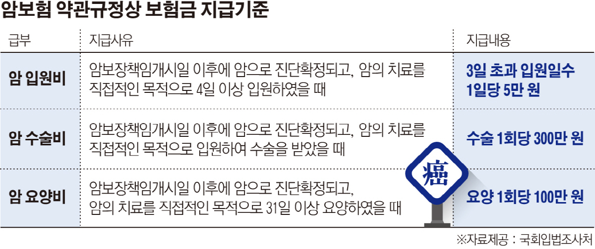 금감원 관계자는 “최근 판례는 말기암 환자가 종합병원에서 계속 암치료를 못하고 면역력 강화를 위해 요양기관이 필요한 경우 직접치료를 위한 입원으로 판단한 것”이라면서 “요양병원 치료 자체가 직접적인 치료라고 볼 수 없다”고 말했다. 약관이 개정된다고 해도 ‘직접적인 암 치료’ 대상이 큰 폭으로 늘어나지 않을 수도 있다는 전망이 나오는 이유다.