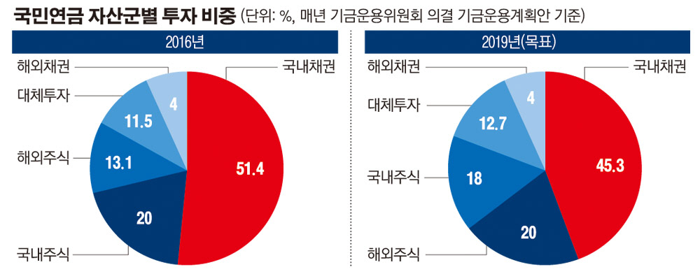 반면, 해외 주식 비중은 올해 17.7%에서 내년 20%까지 늘리기로 했다. 몇 년 전부터 국민연금은 전체 운용자산에서 국내 주식시장 투자 비중이 비정상적으로 높다는 지적에 따라 해외 주식 투자를 늘려왔는데, 내년에는 처음으로 해외 주식 비중이 국내 주식 비중을 넘어서게 된다. 국민연금은 2023년까지 국내 주식 15%, 해외 주식 30% 안팎으로 비중을 조정할 계획이다. 이렇게 되면 앞으로 5년 후에는 해외 주식 투자 비중이 국내 주식의 두 배 정도 규모가 된다.