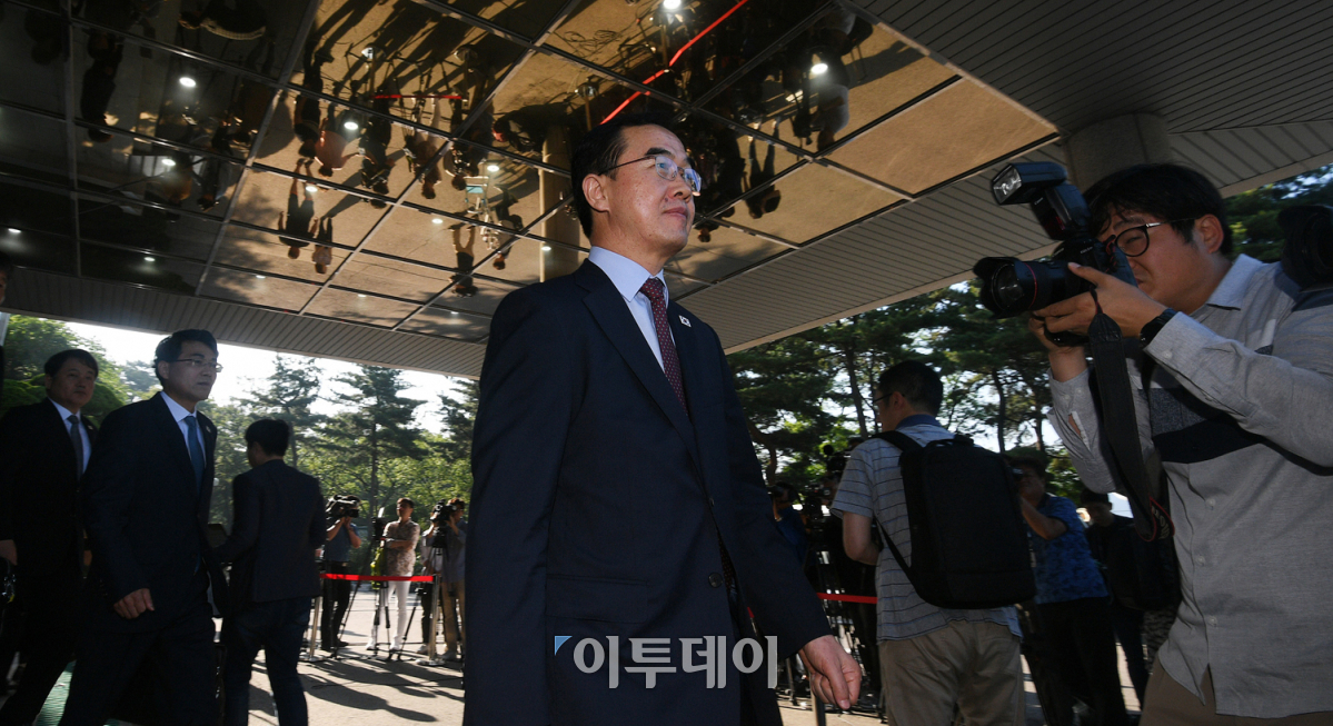 부'판문점 선언' 채택 후 한 달여 만에 남북 고위급 인사들이 만난다. '남북고위급회담'이 개최된 1일 오전 조명균 통일부장관을 비롯한 우리 측 대표단이 서울 종로구 남북회담본부를 나서 판문점으로 출발하고 있다. 남북은 이번 회담에서 철도연결을 비롯한 경제협력, 이산가족상봉 등 '판문점 선언'에 담긴 사항을 두루 논의할 것으로 보인다. 한편, 지난달 16일 열릴 예정이었던 회담은 북한의 일방적인 연기 통보로 무산된 바 있다. 오승현 기자 story@