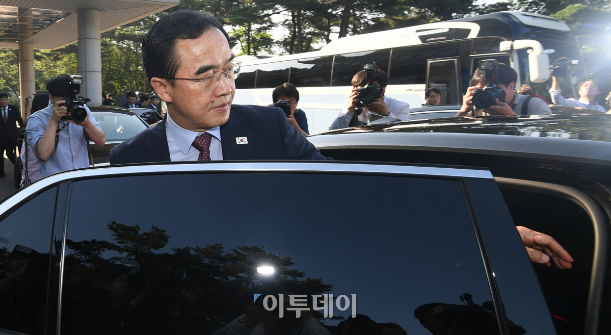 부'판문점 선언' 채택 후 한 달여 만에 남북 고위급 인사들이 만난다. '남북고위급회담'이 개최된 1일 오전 조명균 통일부장관을 비롯한 우리 측 대표단이 서울 종로구 남북회담본부를 나서 판문점으로 출발하고 있다. 남북은 이번 회담에서 철도연결을 비롯한 경제협력, 이산가족상봉 등 '판문점 선언'에 담긴 사항을 두루 논의할 것으로 보인다. 한편, 지난달 16일 열릴 예정이었던 회담은 북한의 일방적인 연기 통보로 무산된 바 있다. 오승현 기자 story@