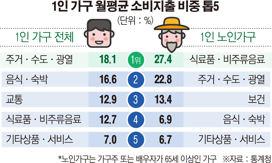통계청이 최근 발표한 가계동향조사(지출부문) 결과에 따르면, 1인 노인가구의 전체 소비지출에서 식료품·비주류음료와 주거·수도·광열이 차지하는 비중은 57.0%로 부부가구(47.9%), 기타가구(43.1%)와 비교해 상대적으로 높았다.