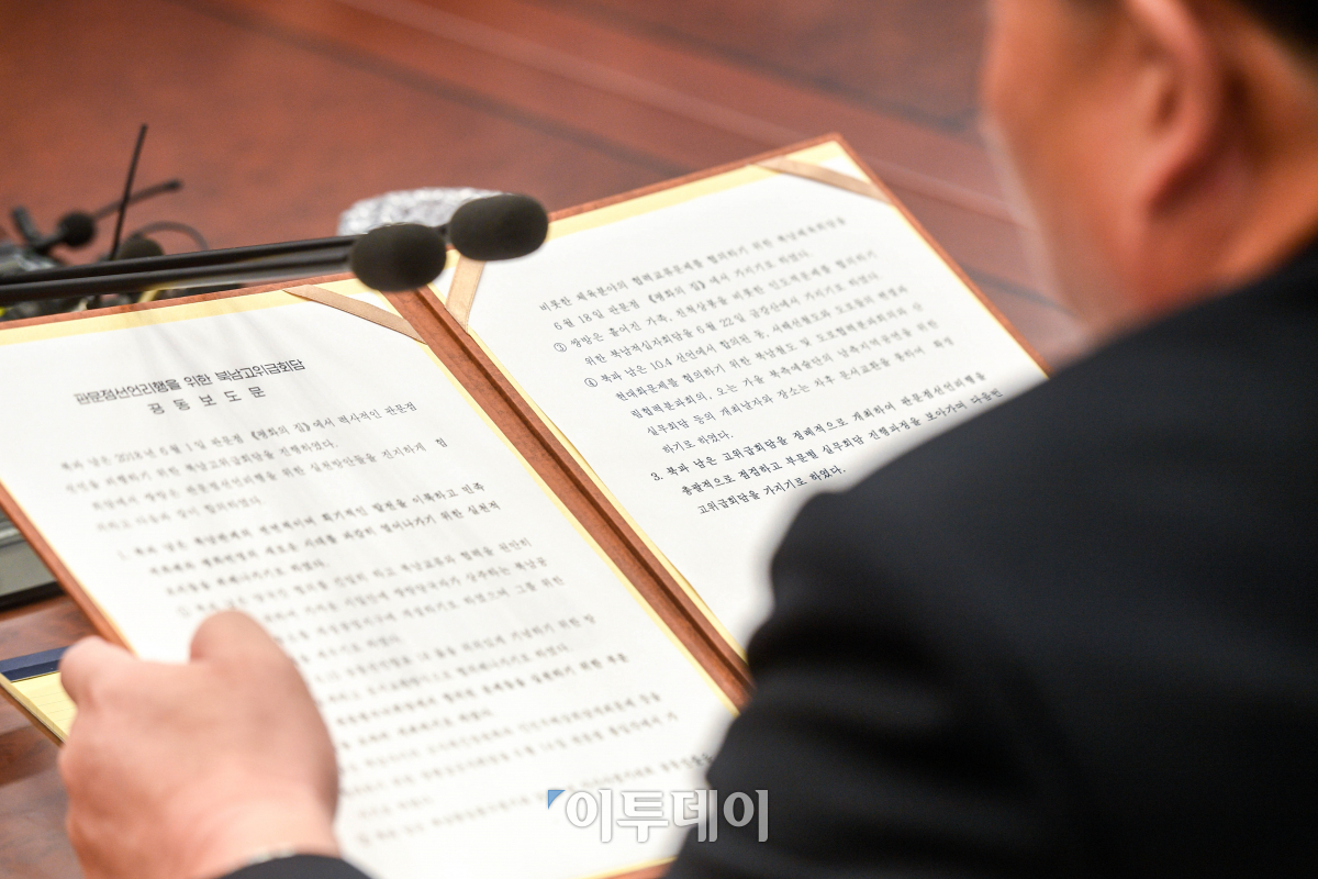 리선권 조국평화통일위원회 위원장이 1일 오후 판문점 남측 평화의집에서 열린 '남북고위급회담'을 마친 뒤 공동보도문을 발표하고 있다. 사진공동취재단