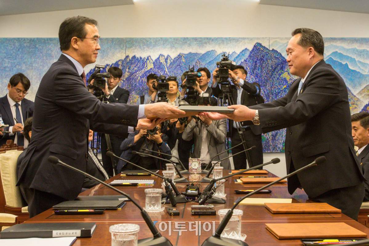 조명균 통일부 장관과 리선권 조국평화통일위원회 위원장이 1일 오후 판문점 남측 평화의집에서 열린 '남북고위급회담'을 마친 뒤 공동보도문을 교환하고 있다. 사진공동취재단