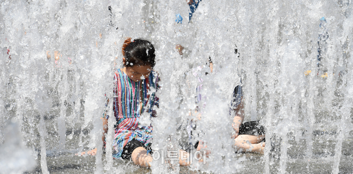 여름의 시작부터 더위가 만만치 않다. 대구의 한낮 기온이 34℃, 서울 30℃를 웃도는 등 불볕더위가 찾아온 3일 서울 종로구 광화문광장에서 어린이들이 바닥에서 내뿜는 시원한 물줄기를 맞으며 더위를 식히고 있다. 기상청은 내리쬐는 강한 햇살로 인해 전국 대부분 지역에 자외선 지수가 '매우 높음' 수준까지 오를 것으로 내다보고, 장시간 야외활동 자제를 당부했다. 오승현 기자 story@