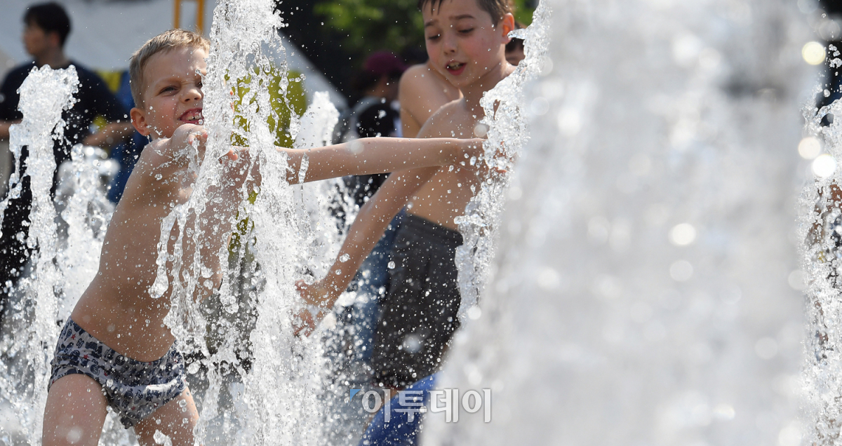 여름의 시작부터 더위가 만만치 않다. 대구의 한낮 기온이 34℃, 서울 30℃를 웃도는 등 불볕더위가 찾아온 3일 서울 종로구 광화문광장에서 금발의 어린이들이 바닥에서 내뿜는 시원한 물줄기를 맞으며 더위를 식히고 있다. 기상청은 내리쬐는 강한 햇살로 인해 전국 대부분 지역에 자외선 지수가 '매우 높음' 수준까지 오를 것으로 내다보고, 장시간 야외활동 자제를 당부했다. 오승현 기자 story@