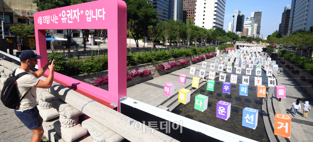 '제7회 전국동시지방선거' 및 '국회의원 재·보궐선거'를 열흘 앞둔 3일 서울 청계천 모전교부터 광통교 구간에 설치된 '6·13 아름다운 지방선거 조형물'이 유권자들의 눈길을 끌며 소중한 권리 행사를 독려하고 있다. 서울시선거관리위원회가 투표 독려를 위해 설치한 이 조형물은 100여 명의 서울시장·교육감·구청장 후보의 선거 벽보 등으로 제작됐다. 오승현 기자 story@