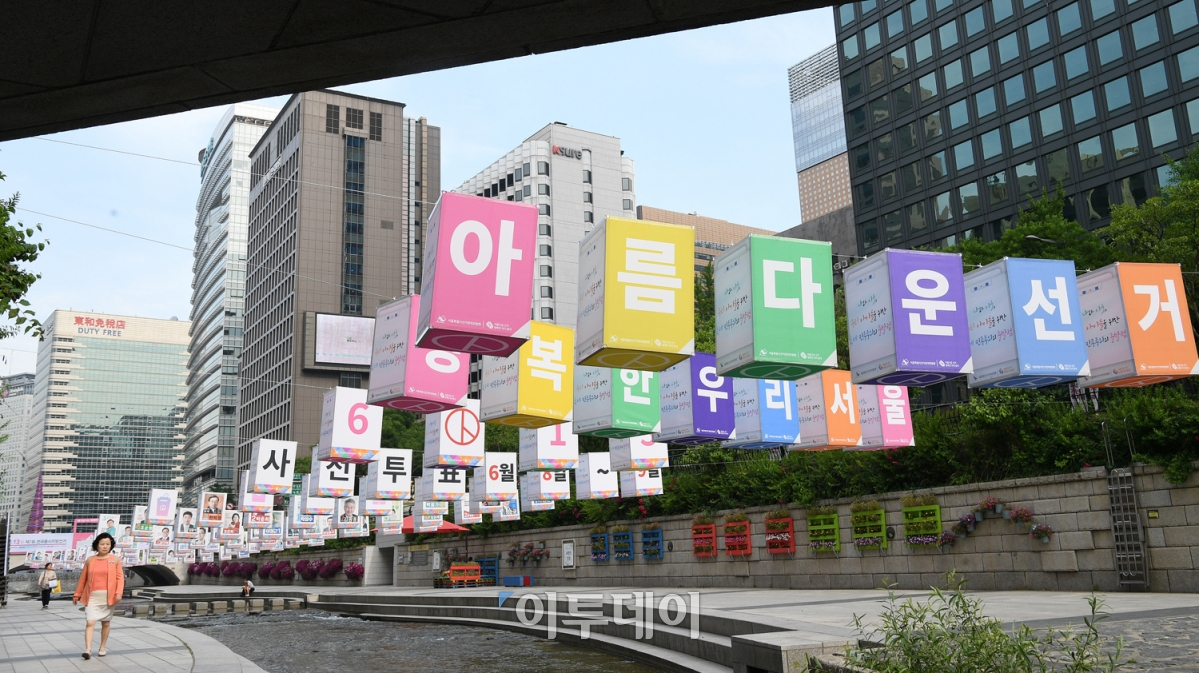 '제7회 전국동시지방선거' 및 '국회의원 재·보궐선거'를 9일 앞둔 4일 오전 서울 청계천 모전교부터 광통교 구간에 설치된 '6·13 아름다운 지방선거 조형물'이 유권자들의 눈길을 끌며 소중한 권리 행사를 독려하고 있다. 서울시선거관리위원회가 투표 독려를 위해 설치한 이 조형물은 100여 명의 서울시장·교육감·구청장 후보의 선거 벽보 등으로 제작됐다. 오승현 기자 story@
