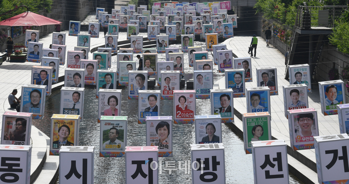 '제7회 전국동시지방선거' 및 '국회의원 재·보궐선거'를 9일 앞둔 4일 오전 서울 청계천 모전교부터 광통교 구간에 설치된 '6·13 아름다운 지방선거 조형물'이 유권자들의 눈길을 끌며 소중한 권리 행사를 독려하고 있다. 서울시선거관리위원회가 투표 독려를 위해 설치한 이 조형물은 100여 명의 서울시장·교육감·구청장 후보의 선거 벽보 등으로 제작됐다. 오승현 기자 story@