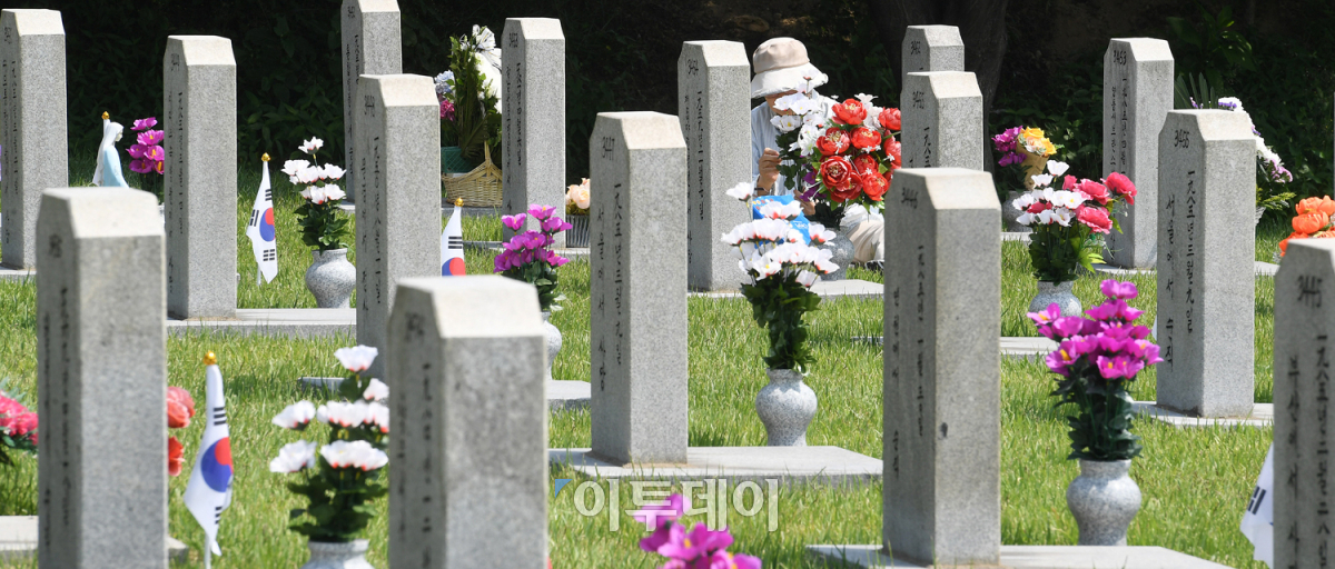 현충일을 앞둔 4일 서울 동작구 국립서울현충원 묘역에서 참배객들이 묘를 돌보며 호국영령의 안식을 기원하고 있다. 한편, 국가보훈처 주관 정부공식행사인 '제63회 현충일 추념식'은 현충일 당일(6일) 국립대전현충원에서 열리며, 정부 주요 인사 및 순직 경찰·소방공무원 유족 등 1만여 명이 참석한다. 오승현 기자 story@
