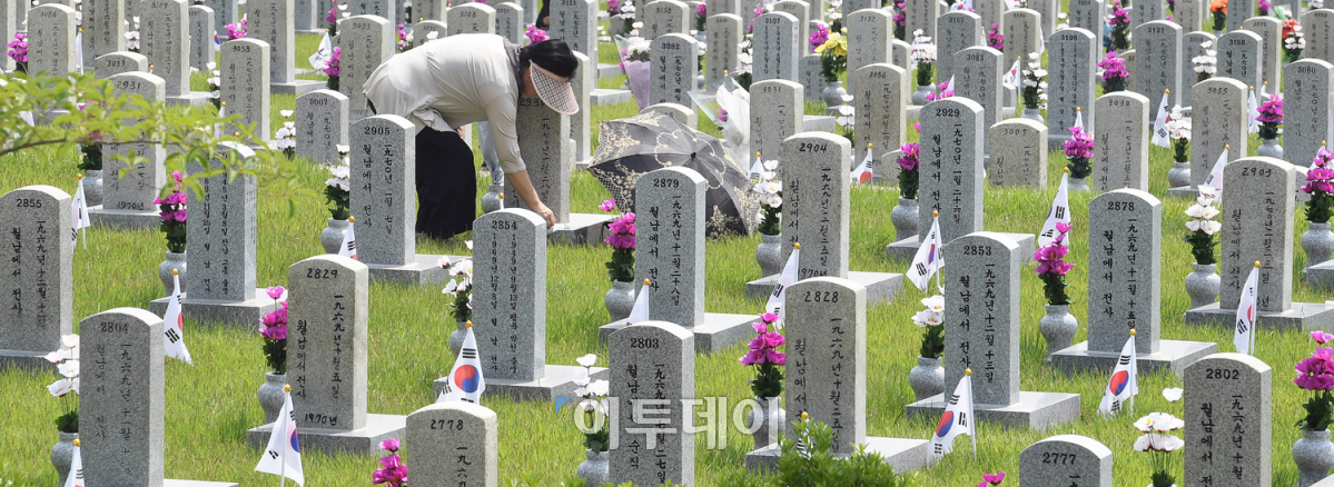 현충일을 앞둔 4일 서울 동작구 국립서울현충원 묘역에서 참배객들이 묘를 돌보며 호국영령의 안식을 기원하고 있다. 한편, 국가보훈처 주관 정부공식행사인 '제63회 현충일 추념식'은 현충일 당일(6일) 국립대전현충원에서 열리며, 정부 주요 인사 및 순직 경찰·소방공무원 유족 등 1만여 명이 참석한다. 오승현 기자 story@