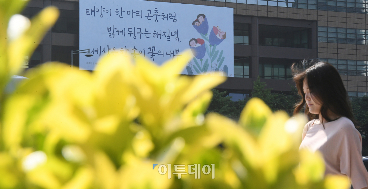광화문 글판이 '여름 편'으로 교체되는 등 가까워진 여름이 실감 난다. 채호기 시인의 '해질녘'에서 발췌한 문안이 5일 오전 서울 종로구 광화문 교보생명빌딩에 설치돼 있다. 새롭게 선보인 '여름 편' 문안은 붉게 노을 지는 저녁 풍경을 바라보며 우리가 사는 이곳이 아름답고 포근한 세상임을 느낀다는 메시지가 담겼다. 오승현 기자 story@