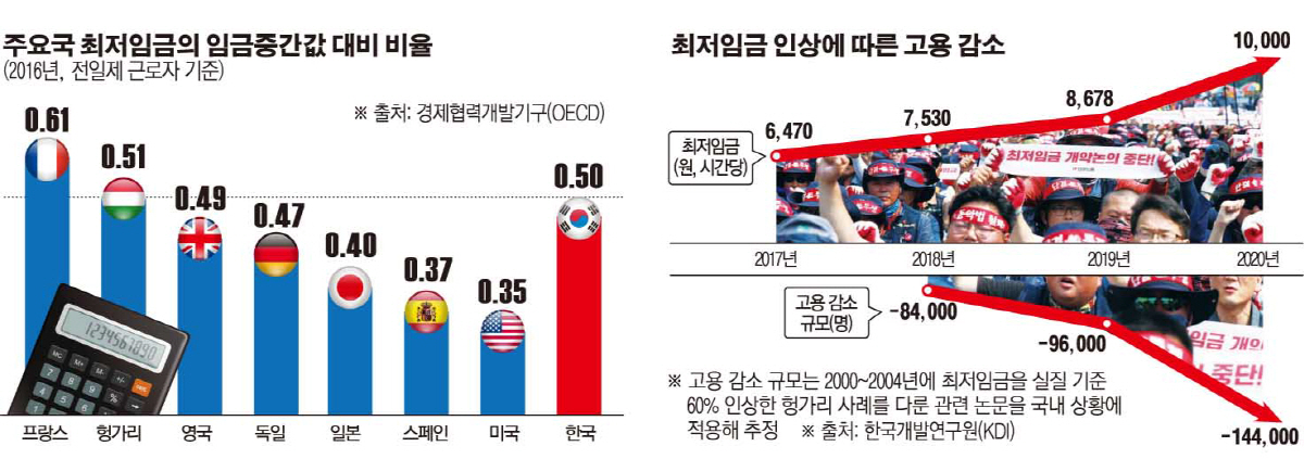 문제는 내년도 인상 폭이다. 문재인 대통령의 공약대로 2020년까지 최저임금 1만 원을 달성하려면 향후 2년간 인상률을 15% 이상으로 유지해야 한다. 이 경우 임금중위값 대비 최저임금 비율은 0.68까지 치솟는데, 이는 최저임금 추가 인상을 멈춘 프랑스(0.61)보다 높은 수준이다.