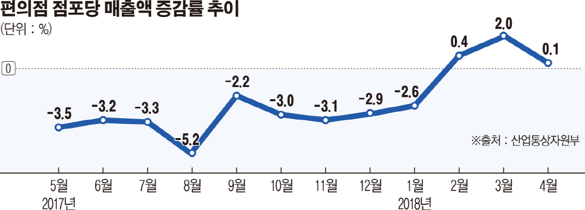 편의점 점포당 매출은 지난해 2월 사상 처음으로 감소(-3.5%)하기 시작해 3월(-1.9%), 5월(-3.5%), 8월(-5.2%), 11월(-3.1%), 올 1월(-2.6%) 등 12개월 연속 1~5%대 역신장했다. 그러다 2월 0.4%로 반등했으며 3월 2.0%에 이어 4월까지 3개월 연속 오름세로 반전됐다.