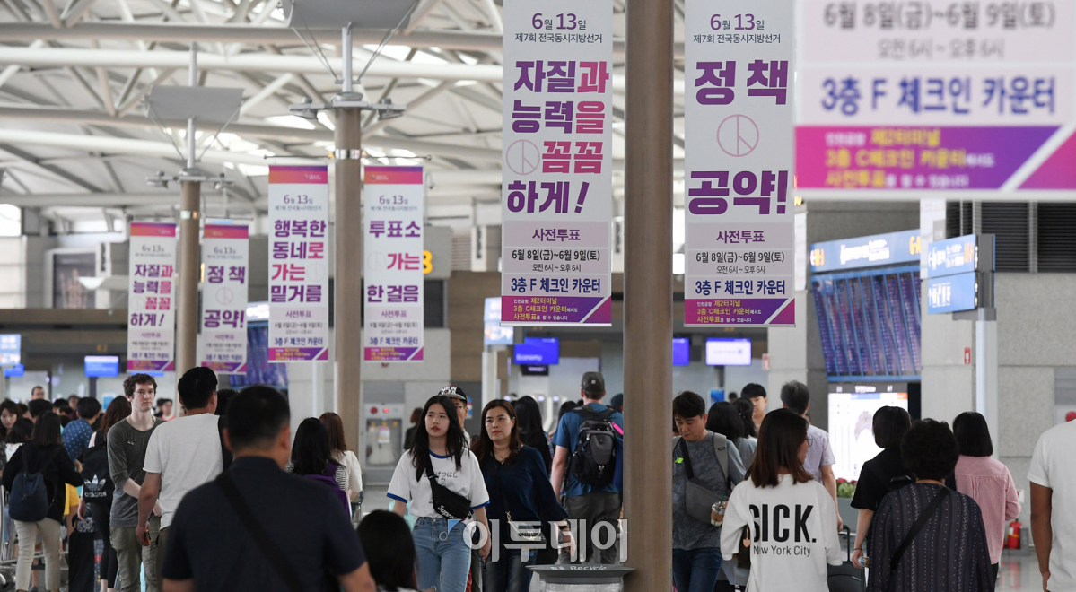 '제7회 전국동시지방선거' 및 '국회의원 재·보궐선거'의 사전투표일을 앞둔 6일 인천국제공항 제1여객터미널 출국장에 사전투표일과 사전투표소를 알리는 배너가 걸려있다. 오는 8일부터 이틀간 진행되는 사전투표는 별도의 부재 신고 없이 신분증만 지참하고 읍·면·동사무소에 설치된 투표소에서 투표할 수 있다. 오승현 기자 story@