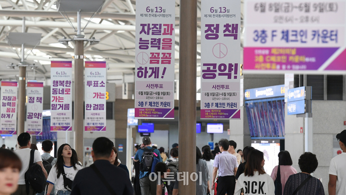 '제7회 전국동시지방선거' 및 '국회의원 재·보궐선거'의 사전투표일을 앞둔 6일 인천국제공항 제1여객터미널 출국장에 사전투표일과 사전투표소를 알리는 배너가 걸려있다. 오는 8일부터 이틀간 진행되는 사전투표는 별도의 부재 신고 없이 신분증만 지참하고 읍·면·동사무소에 설치된 투표소에서 투표할 수 있다. 오승현 기자 story@