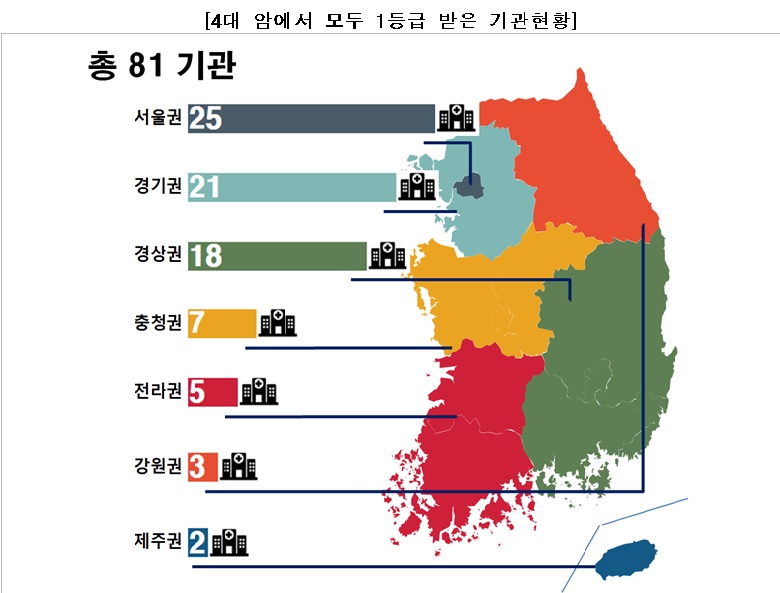 전국에서 4대 암(대장·유방·폐·위) 수술이 이뤄진 의료기관 중 정부가 정한 최고등급인 1등급을 받은 곳이 81곳에 달했다. 1등급을 받은 의료기관들은 지역별로도 골고루 분포한 것으로 나타났다.
