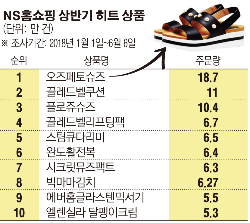 1위는 약 18만7000여 켤레가 판매된 ‘오즈페토 슈즈’, 2위는 약 11만 세트가 판매된 고소영을 모델로 한 ‘끌레드벨 쿠션’, 3위는 약 10만4000켤레가 판매된 ‘플로쥬 슈즈’, 4위는 약 6만7000세트가 판매된 ‘끌레드벨 리프팅팩’까지 모두 패션 뷰티 상품이 명단에 이름을 올렸다. 1위와 3위의 ‘오즈페토 슈즈’와 ‘플로쥬 슈즈’는 같은 디자인의 다른 컬러들이 재구매되는 가심비가 돋보이는 상품이다. 2위와 4위에 자리 잡은 뷰티 브랜드 ‘끌레드벨’은 한 시즌에 내놓는 쿠션과 리프팅팩까지 두 가지 아이템 모두 상위권에 올랐다. 7위에 오른 ‘시크릿뮤즈팩트’는 6만3000세트가 판매됐고, NS홈쇼핑 뷰티 스테디셀러로 손꼽히는 ‘엘렌실라 달팽이 크림’은 5만3000여 세트가 판매되며 10위에 올랐다.