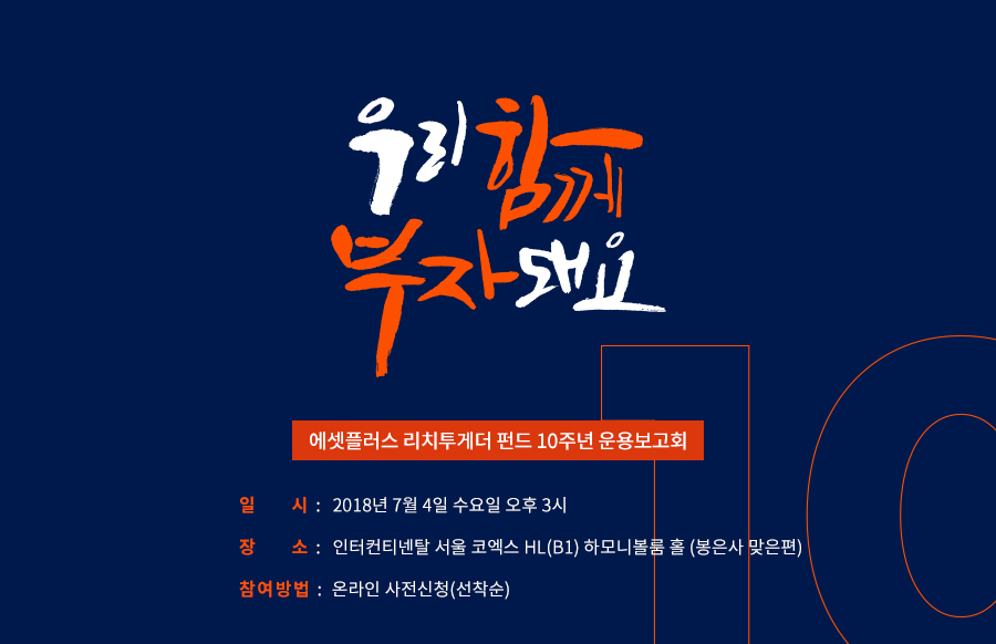 ‘우리 함께 부자 돼요: 2018 에셋플러스 리치투게더 펀드 10주년 운용보고회’는 오는 7월 4일 오후 3시, 인터컨티넨탈 서울 코엑스하모니볼룸 홀에서 열린다. 1부에서는 에셋플러스 강방천 회장과 운용본부의 운용성과보고가 진행될 예정이다. 2부에서는 에셋플러스 강방천 회장, 신영자산운용 허남권 대표, 한국투자밸류자산운용 이채원 대표 등 국내를 대표하는 가치투자자 3인의 대담이 마련돼 있다.