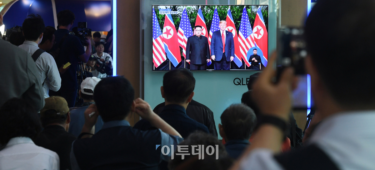 북미 정상이 사상 처음으로 회담장에서 마주하는 세기의 만남에 65년 만의 정전협정 종식과 한반도 비핵화 등 양 정상이 끌어낼 합의에 전 세계의 이목이 쏠리고 있다. 도널드 트럼프 미국 대통령과 김정은 북한 국무위원장의 북미정상회담이 열린 12일 오전 서울역에서 시민들이 정상회담 TV 생중계를 시청하고 있다. 오승현 기자 story@