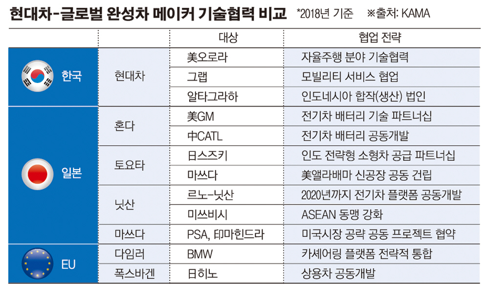 현대차의 공동기술 개발과 협약 등은 이처럼 IT기업과 스타트업, 현지 투자기업에 국한돼 왔다. 글로벌 완성차 기업이 속속 동맹과 공동기술개발, 생산 파트너십 등을 체결하고 있지만 현대차만 독자노선을 고집하고 있는 것. 내연기관에서 친환경 파워트레인으로 빠르게 기술개발 트렌드가 이동하는 만큼 경쟁기업과 파트너십을 철저하게 배제하는 현대차의 경영 전략에 우려가 이어지고 있다.