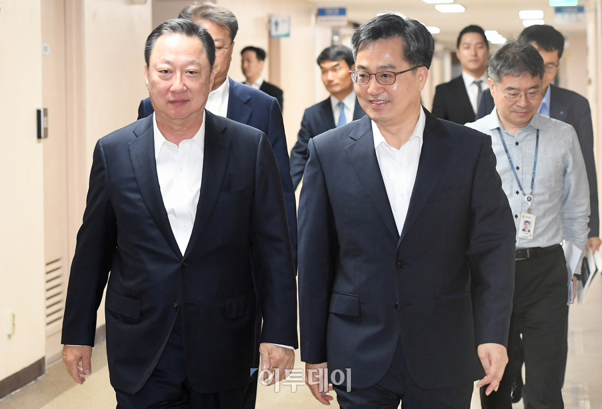 김동연(오른쪽) 경제부총리 겸 기획재정부 장관과 박용만 대한상공회의소 회장이 규제개혁 정책을 논의하기 위해 15일 오전 서울 세종로 정부서울청사 집무실로 입장하고 있다. 이날 김 부총리는 박 회장에게 재계의 규제개혁 정책 건의서를 전달 받고 의견을 나눴다. 오승현 기자 story@