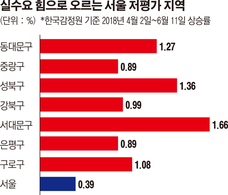 반면 이번 지방선거의 결과로 도시재생 정책이 서울 저평가 지역의 상승세를 주도할 것이란 분석도 제기된다. 권대중 명지대학교 부동산대학원 교수는 “이번 지방선거 결과로 박원순 서울시장이 재당선하면서 도시재생 정책이 힘을 한껏 받게 됐다”며 “정부와 지자체의 정책 방향이 저평가 지역의 환경을 개선하는 쪽이기 때문에 이 지역들의 상승세는 대통령과 시장 임기에 연동될 가능성이 크다”고 전망했다.