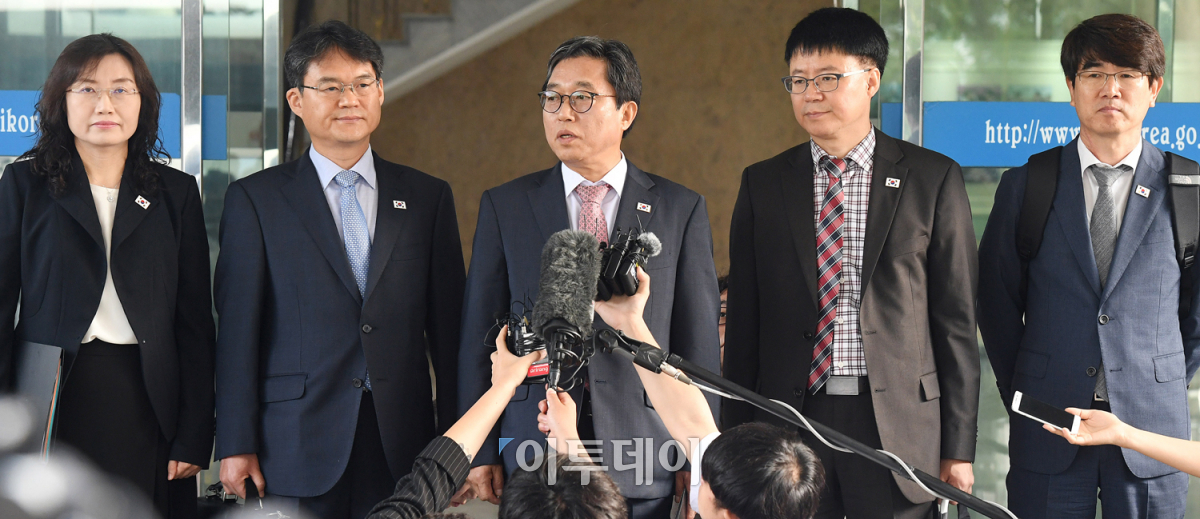 '남북체육회담'의 개최일인 18일 오전 서울 종로구 남북회담본부에서 전충렬(대한체육회 사무총장·가운데) 수석대표를 비롯한 우리 측 대표단이 판문점으로 출발하기 전 취재진의 질의에 답하고 있다. 이번 체육회담에서는 2018 아시아경기대회 및 남북통일농구경기 등 체육 분야 교류협력문제를 협의한다. 오승현 기자 story@