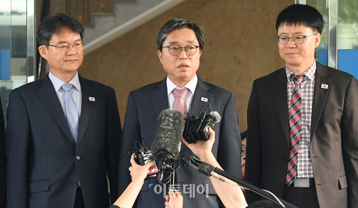 '남북체육회담'의 개최일인 18일 오전 서울 종로구 남북회담본부에서 전충렬(대한체육회 사무총장·가운데) 수석대표를 비롯한 우리 측 대표단이 판문점으로 출발하기 전 취재진의 질의에 답하고 있다. 이번 체육회담에서는 2018 아시아경기대회 및 남북통일농구경기 등 체육 분야 교류협력문제를 협의한다. 오승현 기자 story@