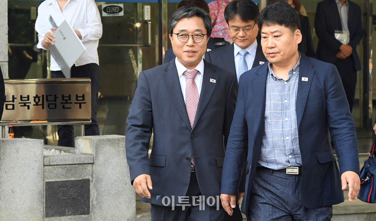 '남북체육회담'의 개최일인 18일 오전 서울 종로구 남북회담본부에서 전충렬 대한체육회 사무총장을 필두로 우리 측 대표단이 판문점으로 출발하고 있다. 이번 체육회담에서는 2018 아시아경기대회 및 남북통일농구경기 등 체육 분야 교류협력문제를 협의한다. 오승현 기자 story@